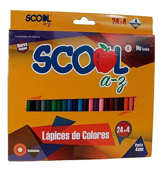 24 lápices de colores: blanco, amarillo, amarillo canario, carne, durazno, naranja, café, marrón, rojo, rojo obscuro, rosa, fucsia, magenta, morado, azul cielo, azul, azul medio, turqueza, verde esmeralda, verde claro, verde obscuro, gris claro, gris obscuro, negro más 4 lápices de colores neón: verde neón, naranja neón, amarillo neón, rosa neón.Punta resistente de 4 mm. Redondos. No tóxico. Mayor intensidad de color.